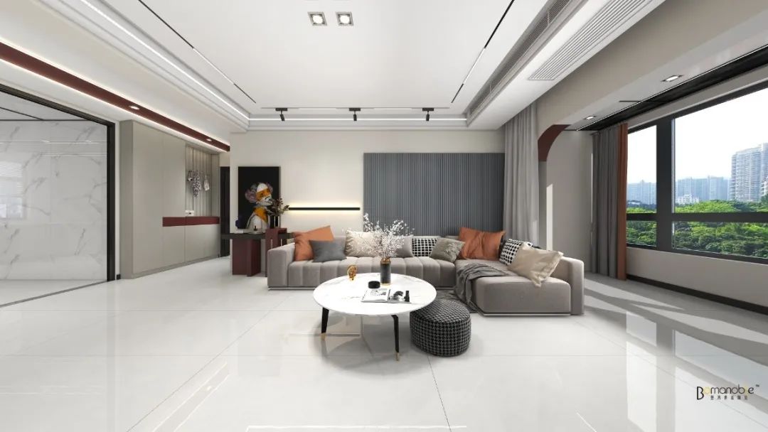 墙地一体的瓷砖通铺将流畅肌理融为基底,整体风格分明有序。光线下的家居线条浑然天成,呈现无限延伸,模糊空间边界,丰盈居所形态,打造大气的生活氛围。